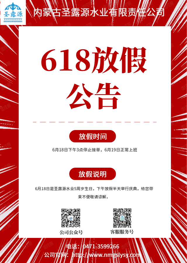 618是圣露源桶装水在呼和浩特扎根立足5周年纪念日,公司放假半天举行庆典,望您谅解!