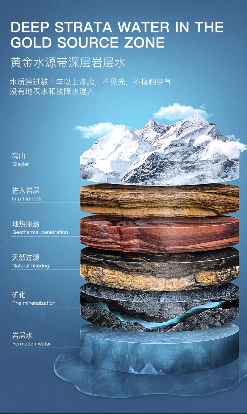 天然矿泉水是水与储水岩层经过数百年乃至数千年长期接触,在一定的环境温度和压力下互相作用,岩层的矿物质溶解于水中而形成。天然矿泉水的储水带与地表水天然隔离,不受污染。矿泉水有多种类型,例如偏硅酸型(偏硅酸大于25mg/L)、锶型(锶含量大于0.2mg/L)等等,圣露源岩泉水就属于锶型矿泉水。